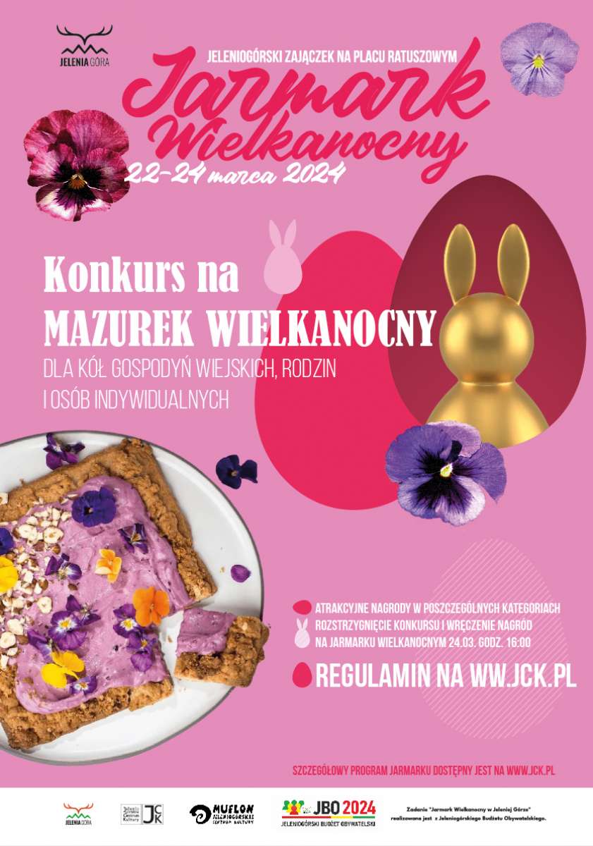 Zapraszamy mieszkańców miasta i powiatu Jelenia Góra oraz powiatu karkonoskiego, grupy formalne i nieformalne oraz Koła Gospodyń Wiejskich do udziału w przepysznym konkursie na "Wielkanocny mazurek". Wypieki zgłaszane do konkursu wraz z wypełnionym formularzem należy dostarczyć w dniu 24 marca 2024 w godz. 9.00-10.00 do hali namiotowej na Jarmarku Wielkanocnym w Jeleniej Górze na Placu Ratuszowym. Do mazurka prosimy dołączyć recepturę oraz przepis mówiący jak został wykonany. Dla zwycięzców zaplanowano nagrody w formie bonów upominkowych o wartości 600 zł, 400 zł, 300 zł oraz 2 wyróżnienia w formie niespodzianki! Rozstrzygnięcie konkursu i wręczenie nagród nastąpi w dniu 24 marca 2024 ok. godz. 16:00 podczas Jarmarku Wielkanocnego na Placu Ratuszowym w Jeleniej Górze.